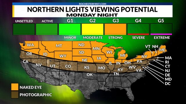 In response to the Saturday solar flare, NOAA has issued a “Strong” (G3) Geomagnetic Storm Watch for late Monday into early Tuesday. At G3, the northern lights can become visible across mid-latitudes of the United States.